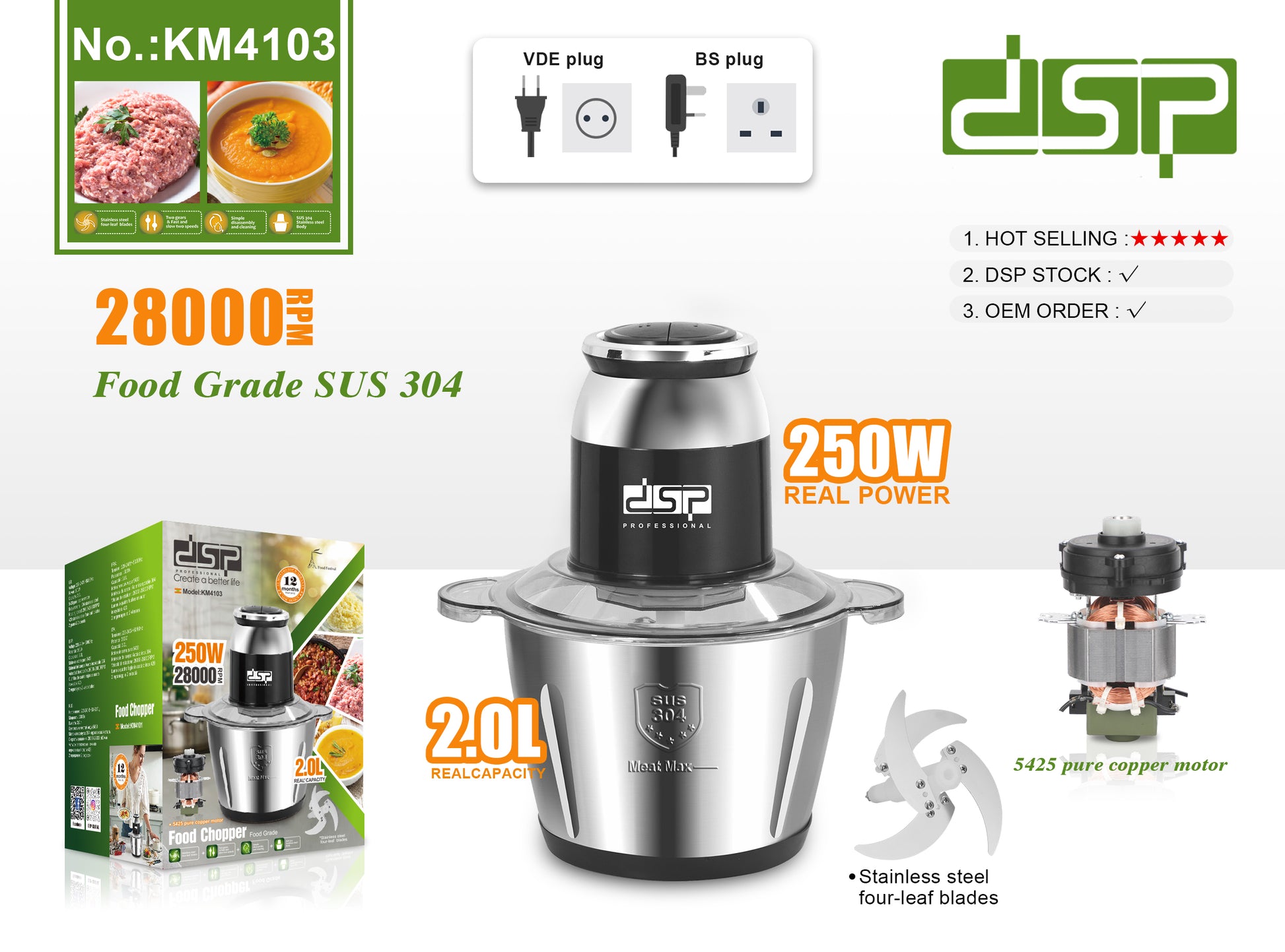 The DSP KM4103 Food Chopper features a 250W pure copper motor and 26,000-28,000 RPM high-speed rotation, effortlessly chopping hard/soft ingredients like meat, garlic, or ice in seconds. The 420 stainless steel 4-blade design ensures even results every time.