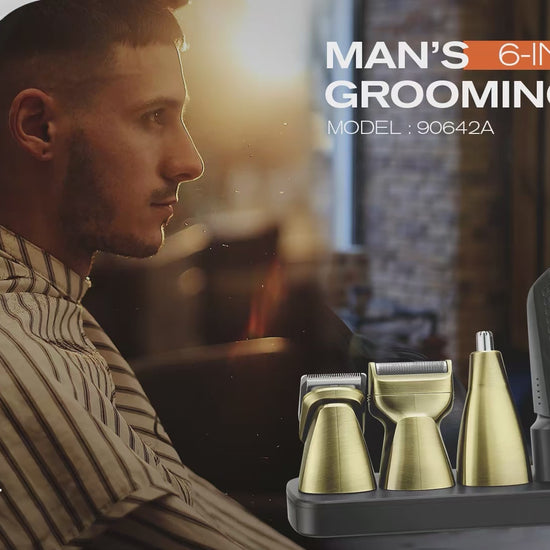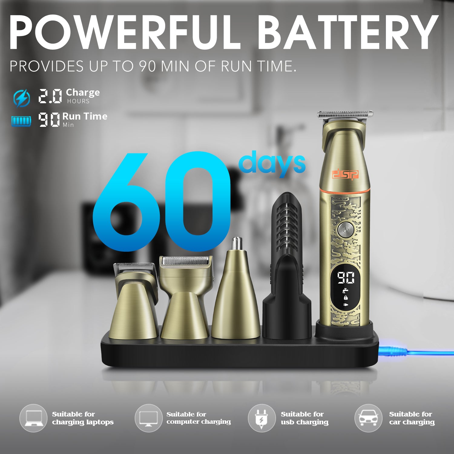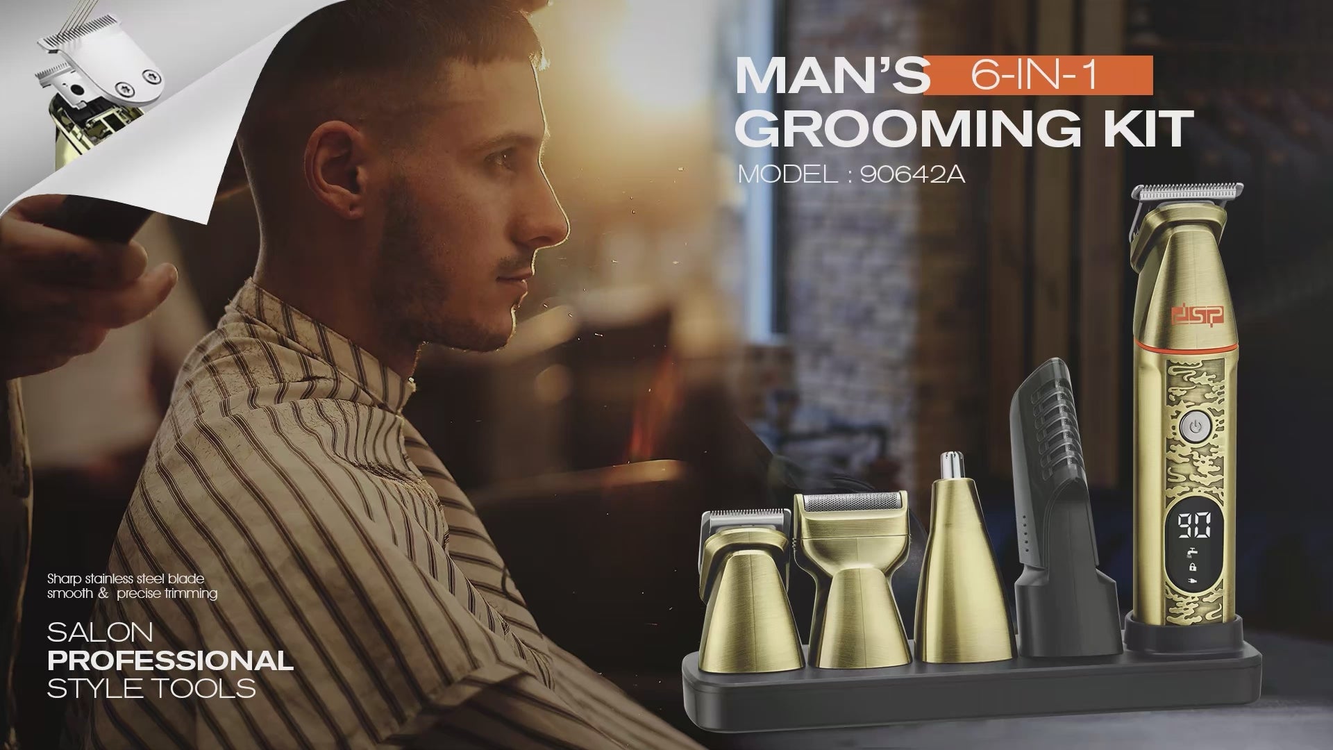 1. 6-in-1 All-in-One Grooming Kit – This DSP men's grooming kit (Model 90642A) includes 13 accessories: 4 limit combs, T/U-shaped heads, nose/body trimmer, shaver, and more. Perfect for beard trimming, haircuts, and body grooming at home. IPX6 waterproof design ensures easy cleaning.