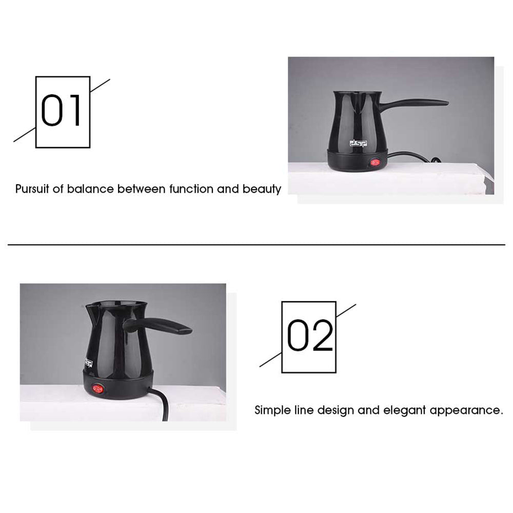 1. Premium Turkish Coffee Pot DSP's 300ml coffee maker delivers authentic Turkish/Greek/Arabic coffee with its food-grade tin lining and stainless steel body. The 600W hidden heating element ensures even heat distribution while the red indicator light provides safe operation. Perfect for gas, electric, or induction stoves.